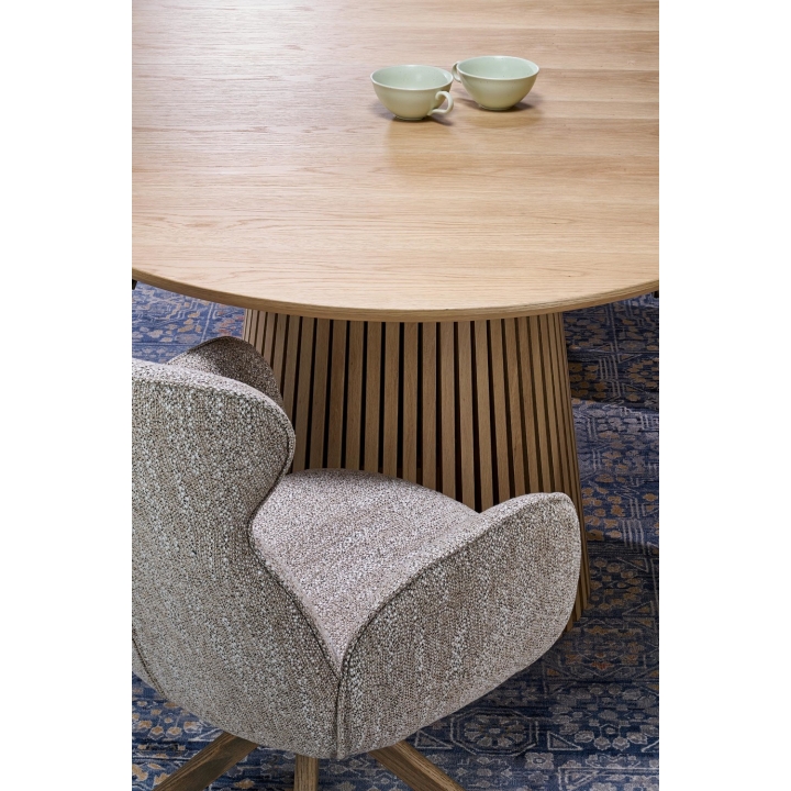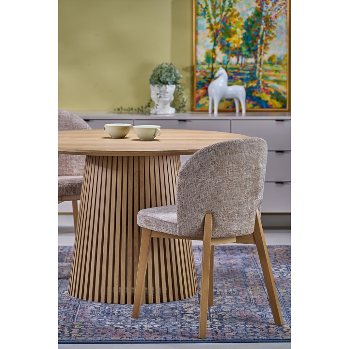 Mebel powstał z płyty MDF pokrytej naturalną okleiną, co zapewnia wytrzymałość i odporność na uszkodzenia. Wyróżniającym się elementem konstrukcji są nogi wykonane w formie pionowych lameli. Taka budowa wprowadza do wnętrza wizualną lekkość. Połączenie tradycyjnego materiału z nietypowym kształtem podstawy sprawia, że model Fargo przyciąga wzrok i pasuje do współczesnych trendów.