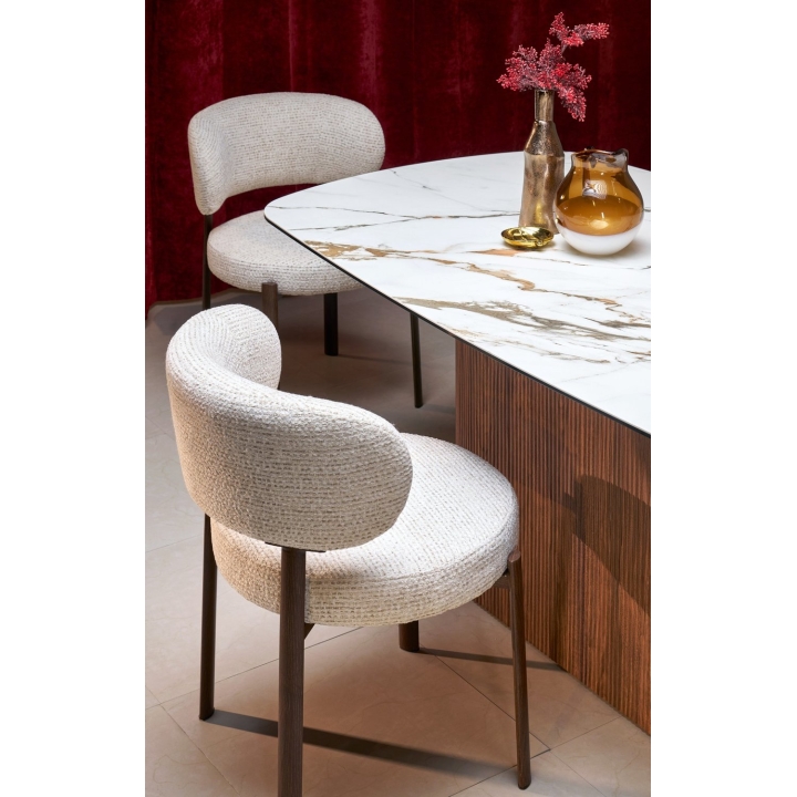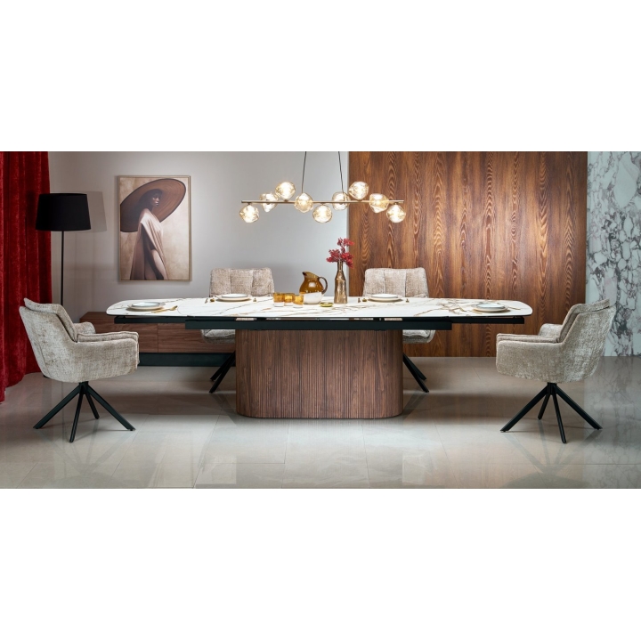 Stół Flavor to idealna propozycja do przestronnych jadalni. Owalny blat o szerokości 200 cm i głębokości 100 cm. W wersji podstawowej zapewnia on swobodną przestrzeń dla ośmiu osób, natomiast po rozłożeniu jego szerokość wzrasta do 300 cm, co pozwala stworzyć wygodne miejsce dla nawet dwunastu osób.