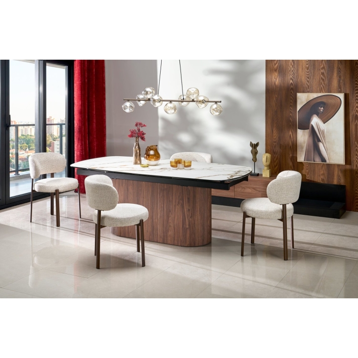 Konstrukcja opiera się na blacie wykonanym z ceramiki w odcieniu beżowego marmuru, który spoczywa na solidnej podstawie z płyty MDF w głębokim, orzechowym kolorze. Jasna powierzchnia ceramiczna w połączeniu z ciemnym drewnem tworzy kontrastowe zestawienie, które nadaje wyrazistego charakteru.