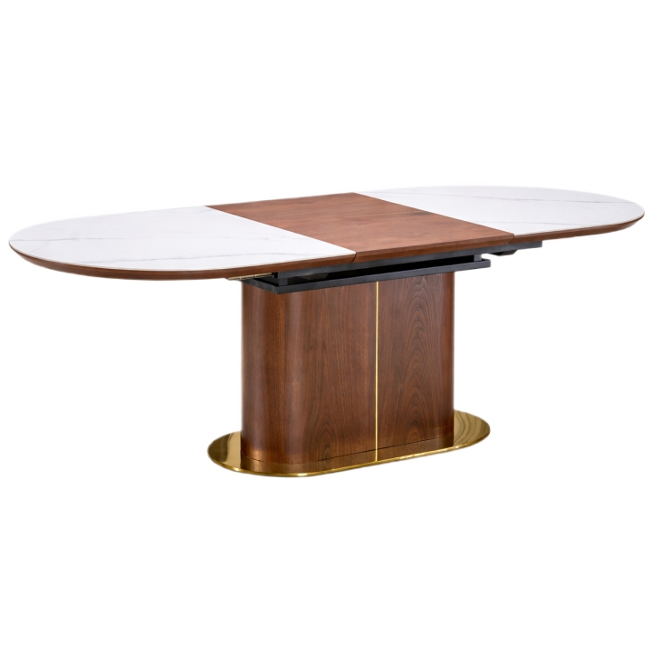 Nowoczesny charakter podkreślają dodatkowo złote detale umieszczone przy podstawie, które współgrają z orzechowym wykończeniem nogi. Centralne umiejscowienie kolumny zapewnia użytkownikom pełną swobodę ruchów i ułatwia optymalne rozmieszczenie krzeseł wokół stołu.