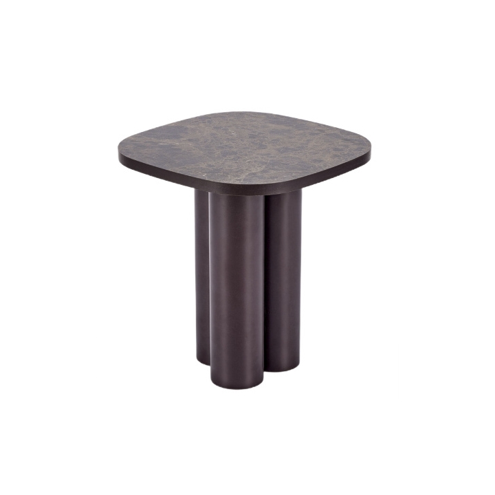 Konstrukcja mebla opiera się na stabilnym stelażu z płyty MDF w kolorze głębokiego brązu. Powierzchnia blatu została wykonana z okleinowanego MDF-u o wzorze ciemnego marmuru, który tworzy spójną kompozycję z ciemną podstawą. Wykorzystane materiały zapewniają odporność na codzienne użytkowanie, a kompaktowa forma pozwala na sprawne przestawianie stolika w zależności od aktualnych potrzeb domowników.