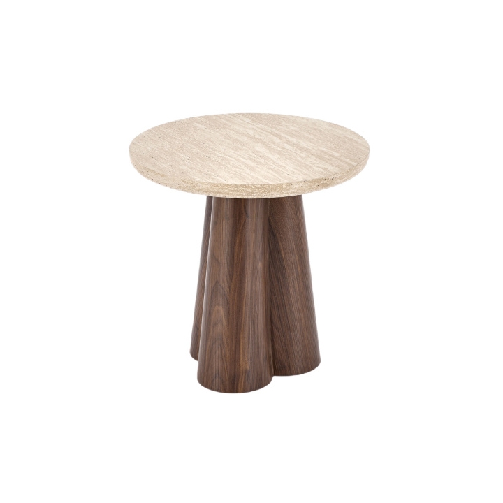 Podstawa została wykonana z płyty MDF w ciemnym, orzechowym kolorze, co zapewnia stabilność całej konstrukcji. Blat z okleinowanej płyty MDF w beżowym odcieniu trawertynu dobrze łączy się z ciemnym stelażem. Zastosowane materiały są wytrzymałe, co pozwala na bezproblemowe korzystanie ze stolika podczas codziennego odpoczynku.