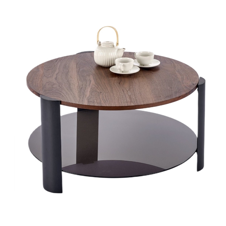 Górny blat w ciemnym, orzechowym kolorze został wykonany z okleinowanej płyty MDF. Pod nim znajduje się dodatkowy poziom z czarnego szkła - to dodatkowa przestrzeń na telefon, piloty czy gazety. Dzięki takiemu rozwiązaniu główny blat pozostaje uporządkowany i gotowy do użytku.