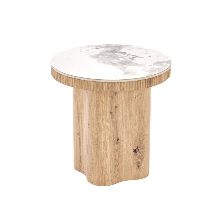 Blat wykonano z trwałego spieku o wzorze białego marmuru, a podstawę z płyty MDF w ciepłym odcieniu dębu. Dolna część mebla ma delikatnie falowany kształt, co nadaje bryle lekkości i wyróżnia ją na tle standardowych konstrukcji.