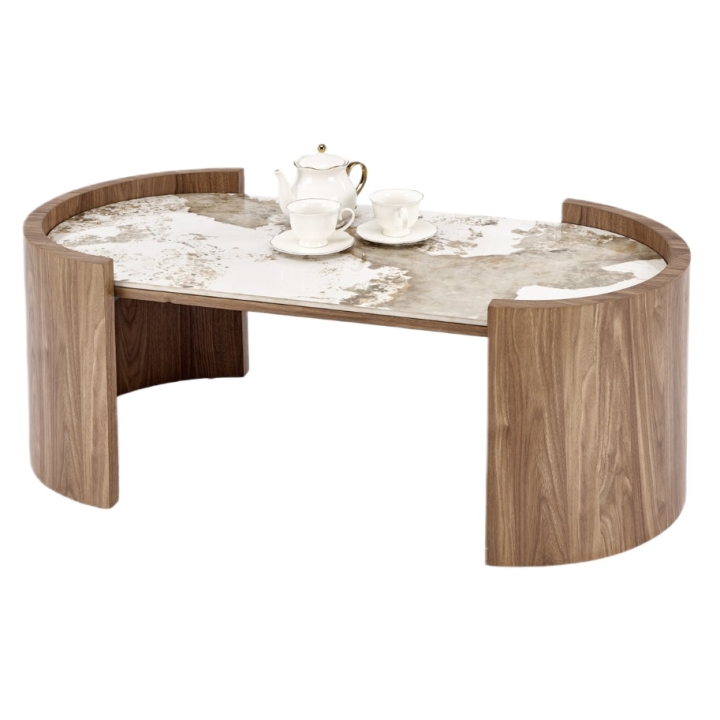 Blat wykonano z trwałego spieku o wzorze naturalnego, beżowego marmuru, co gwarantuje wysoką odporność na codzienne użytkowanie. Nogi z płyty MDF w ciemnym odcieniu orzecha stabilizują konstrukcję i tworzą spójne zestawienie z jasną górą. Wykorzystane materiały są proste w pielęgnacji i zapewniają trwałość.