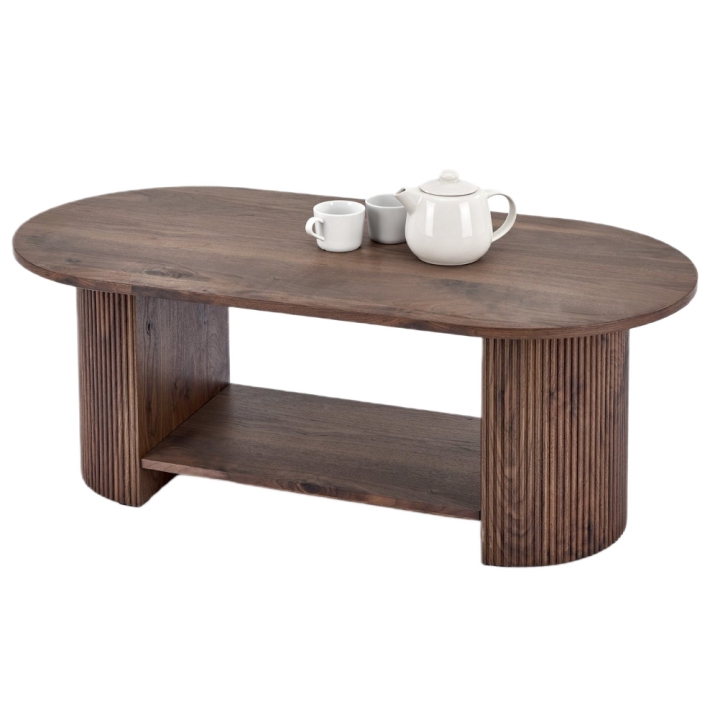 Ława Perila o szerokości 120 cm i głębokości 60 cm sprawdzi się idealnie jako stolik kawowy, który oferuje dwa poziomy do przechowywania. Owalny blat nadaje całości łagodnego charakteru. Wysokość 45 cm zapewnia wygodny dostęp do obu poziomów mebla.