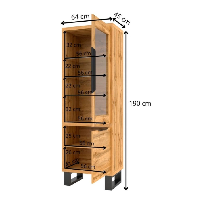 Konstrukcja witryny oparta jest na dwóch drzwiczkach, które dzielą bryłę na dwie strefy – ekspozycyjną i zamkniętą. Wysokość mebla wynosi 190 cm, szerokość 64 cm, a głębokość 45 cm, co pozwala uzyskać proporcje wygodne do codziennego użytkowania, a jednocześnie zachować lekkość formy. Takie wymiary czynią witrynę odpowiednią zarówno do przestronnych salonów, jak i mniejszych pomieszczeń, gdzie liczy się optymalne zagospodarowanie miejsca.
