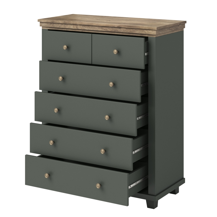 Wykończenie w kolorze Dąb Lefkas (laminat) połączone z Zielonym nadaje całości niepowtarzalnego charakteru. Zestawienie barw przyciąga uwagę i tworzy spójną, wyrazistą formę, która może stanowić akcent w wystroju wnętrza. Taki dobór kolorystyczny ułatwia dopasowanie komody do różnych aranżacji.