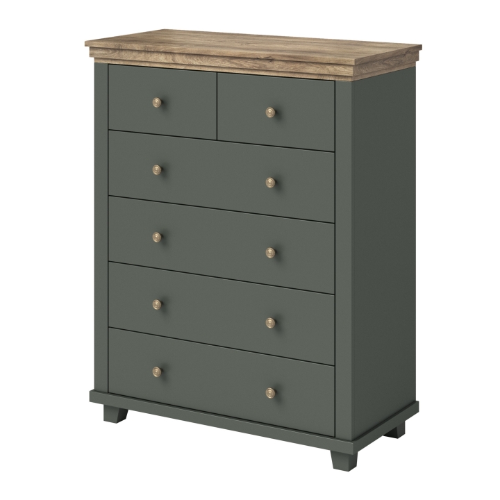 Komoda Helvetia wyróżnia się połączeniem solidnej budowy, nowoczesnego wzornictwa oraz dużej pojemności. Sześć szuflad i szafka zapewniają odpowiednią ilość miejsca na przechowywanie rzeczy, a staranne wykończenie sprawia, że mebel prezentuje się estetycznie w każdej przestrzeni. To rozwiązanie, które umożliwia uporządkowanie wnętrza i wprowadzenie do niego spójności.