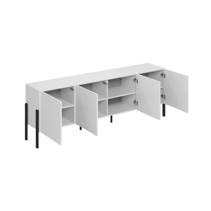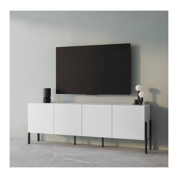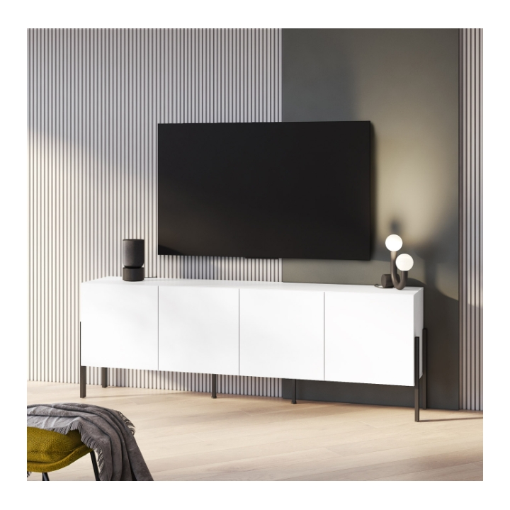 Konstrukcja jest czterodrzwiowa. Za każdym frontem skrywa się przestrzenna półka. Łącznie cztery półki umożliwiają wygodne przechowywanie i uporządkowanie wybranych przedmiotów lub sprzętu. Szafka nie posiada uchwytów – fronty otwierane są za pomocą systemu push-to-open, co eliminuje wystające elementy. Blat mebla, o szerokości ponad dwóch metrów, pozwala na bezpieczne ustawienie telewizora o dużej przekątnej, z zachowaniem wolnej przestrzeni na głośniki lub inne elementy.