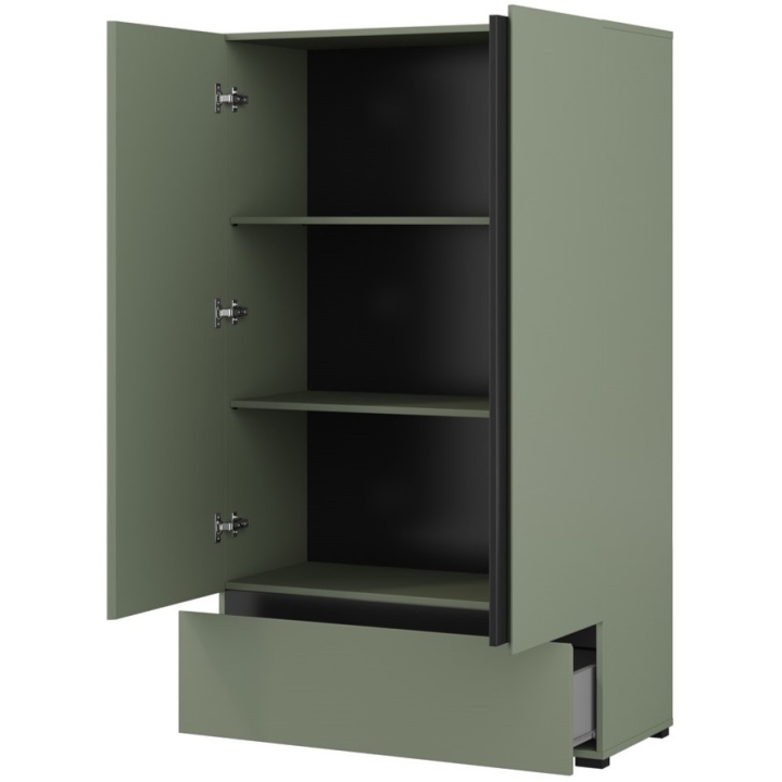 Bieliźniarka wyposażona jest w 2 uchylne drzwi, za którymi znajdują się 3 głębokie półki, pozwalające na uporządkowane przechowywanie odzieży lub tekstyliów domowych. W dolnej części znajduje się 1 pojemna szuflada montowana na prowadnicach kołkowych, co zapewnia wygodny i płynny dostęp do zawartości. Taki układ pozwala na praktyczne rozdzielenie różnych kategorii przechowywanych rzeczy.