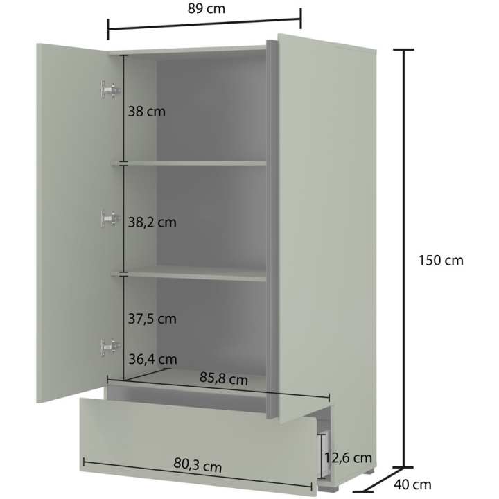 Mebel ma wymiary szerokość 89 cm, wysokość 150 cm, głębokość 40 cm, co czyni go odpowiednim do średnich i większych pomieszczeń. Konstrukcja opiera się na niskich czarnych nogach, które nadają mu lekkiego charakteru i ułatwiają utrzymanie czystości pod szafką. Całość została zaprojektowana w spójnym zestawie meblowym, co pozwala na harmonijne wyposażenie przestrzeni.
