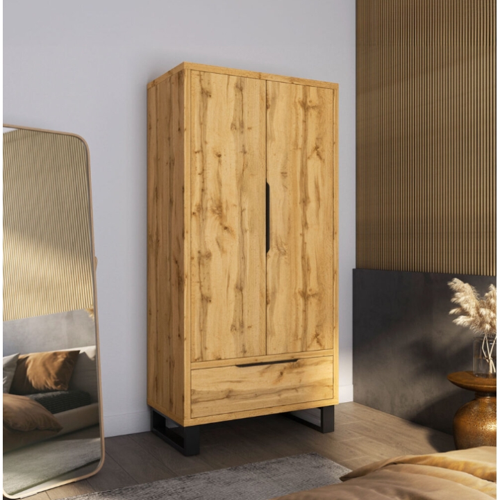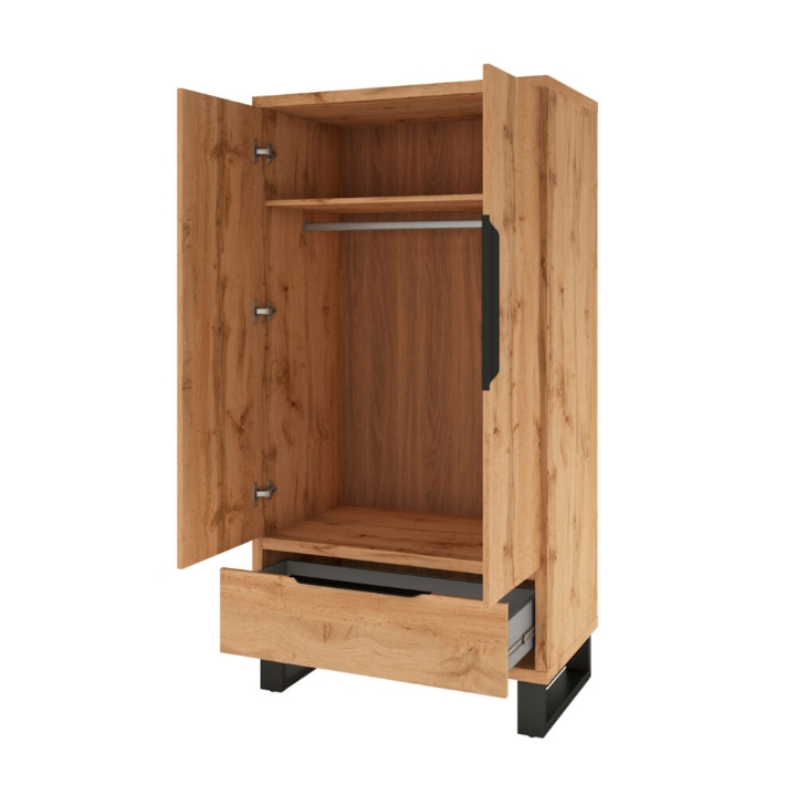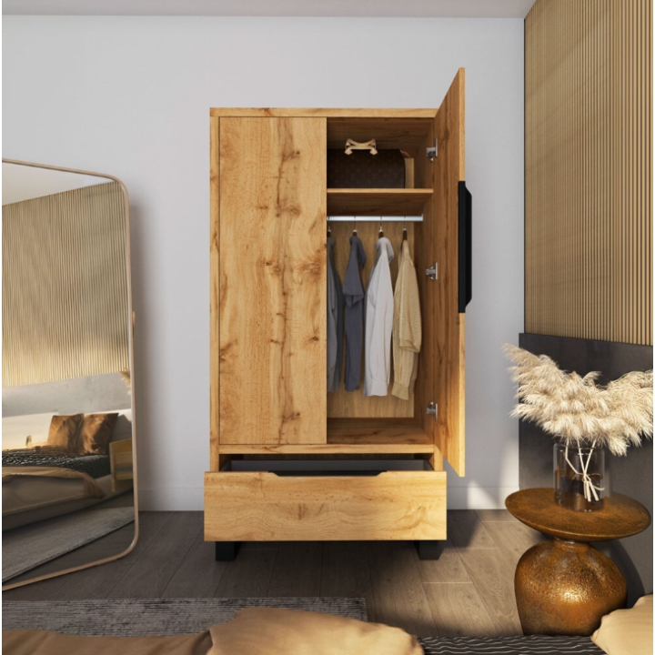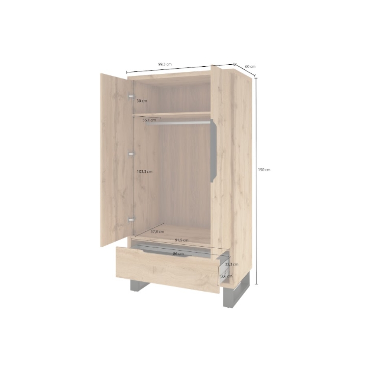 Szafa ma wymiary 99 cm szerokości, 190 cm wysokości i 60 cm głębokości. Wewnątrz znajduje się półka oraz drążek, które pozwalają uporządkować odzież według własnych potrzeb. Na dole umieszczono obszerną szufladę, która świetnie sprawdzi się do przechowywania dodatkowych elementów garderoby.