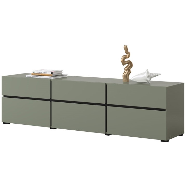 Szafka RTV została zaprojektowana w sposób zapewniający przejrzysty układ miejsca do przechowywania. Składa się z 3 szufladek, które sprawdzą się w segregacji drobnych przedmiotów, oraz 3 uchylnych schowków otwieranych od góry, idealnych na akcesoria telewizyjne czy kolekcję płyt. Przemyślana organizacja wnętrza pozwala zachować estetyczny porządek w strefie multimedialnej.