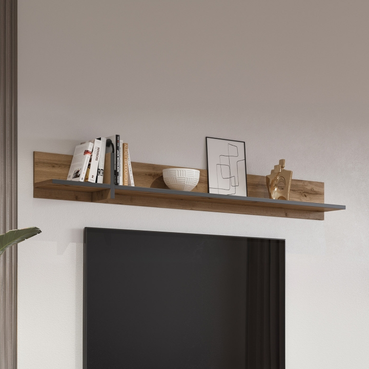 Wymiary półki to szerokość 118 cm, wysokość 23 cm oraz głębokość 23 cm. Takie proporcje pozwalają na swobodne ustawienie książek, ozdób czy drobnych elementów dekoracyjnych, nie przytłaczając jednocześnie wnętrza. Mebel pełni rolę zarówno praktycznego miejsca do przechowywania, jak i subtelnej dekoracji ściany.