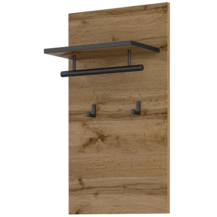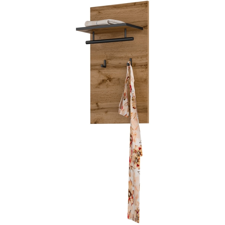 Model został wyposażony w jedną półkę, drążek oraz dwa wieszaki, co pozwala na uporządkowanie zarówno okryć wierzchnich, jak i drobniejszych akcesoriów. Dzięki temu panel stanowi zorganizowane miejsce na najczęściej używane elementy garderoby. Rozmieszczenie poszczególnych części zostało zaplanowane tak, aby zapewnić łatwy dostęp do przechowywanych rzeczy.