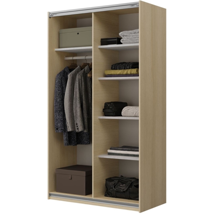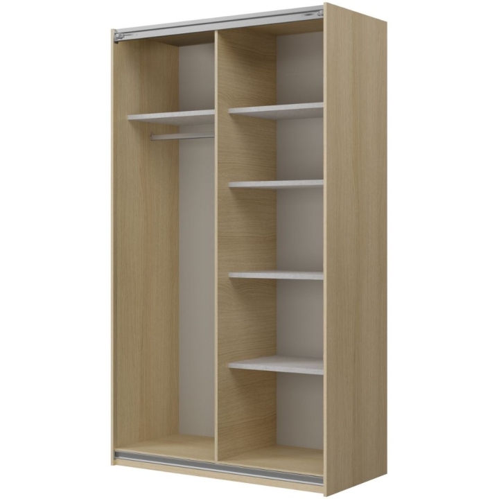 Mebel ma wymiary szerokość 120 cm, wysokość 210 cm i głębokość 60 cm, co czyni go uniwersalnym rozwiązaniem zarówno do sypialni, jak i garderoby czy pokoju młodzieżowego. Dzięki tym proporcjom szafa oferuje znaczną pojemność, a jednocześnie nie przytłacza przestrzeni. Brak nóżek sprawia, że konstrukcja stoi stabilnie, dobrze przylegając do podłoża.