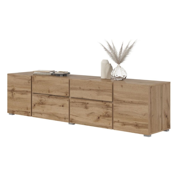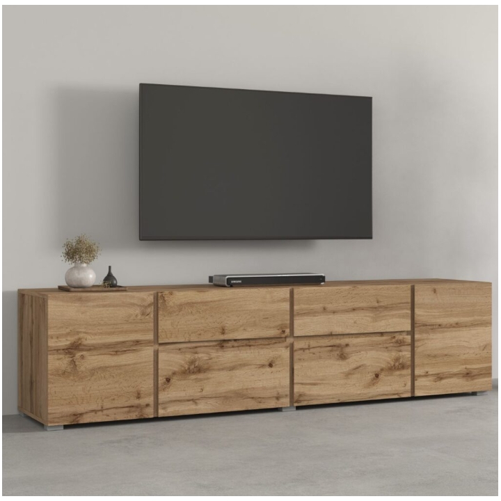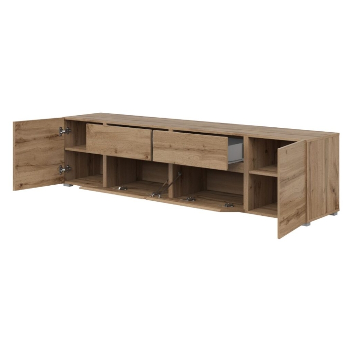W centralnej części szafki znajdują się dwie szuflady na drobne akcesoria, kable czy piloty. Bezpośrednio pod szufladami umieszczono dwie klapy otwierane w dół, które stanowią dobre miejsce na konsole lub dekodery. Po bokach mebla znajdują się dwie szafki zamykane tradycyjnymi drzwiczkami. Wewnątrz każdej z nich zamontowano dodatkową półkę, co ułatwia ułożenie kolekcji gier, płyt czy instrukcji obsługi sprzętu.