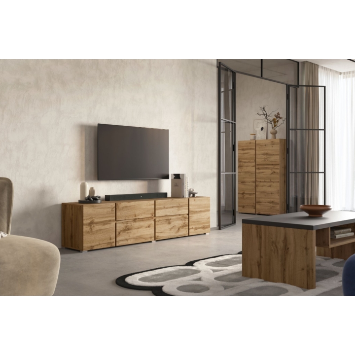 Szafka RTV Asymetric od Helvetia Wieruszów to mebel o szerokości 195 cm, wysokości 48 cm i głębokości 40 cm. Takie wymiary pozwalają na stabilne ustawienie dużego ekranu telewizora oraz swobodne rozmieszczenie sprzętu multimedialnego. Producent Helvetia Wieruszów zaprojektował ten model tak, aby maksymalnie wykorzystać przestrzeń do przechowywania przy zachowaniu prostej bryły.