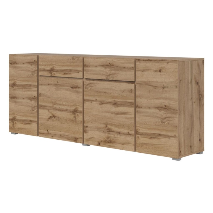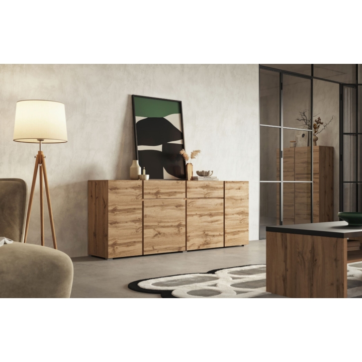 Komoda Asymetric to duży mebel do przechowywania o szerokości 195 cm, wysokości 78 cm i głębokości 40 cm. Ze względu na swoje wymiary i niską konstrukcję, idealnie sprawdza się w salonie, sypialni lub przedpokoju, oferując jednocześnie szeroki blat do zagospodarowania. Mebel został wykonany z solidnej płyty meblowej w dwóch wariantach kolorystycznych do wyboru - dąb wotan oraz białym.