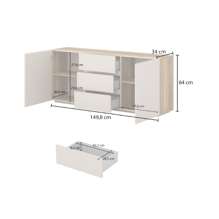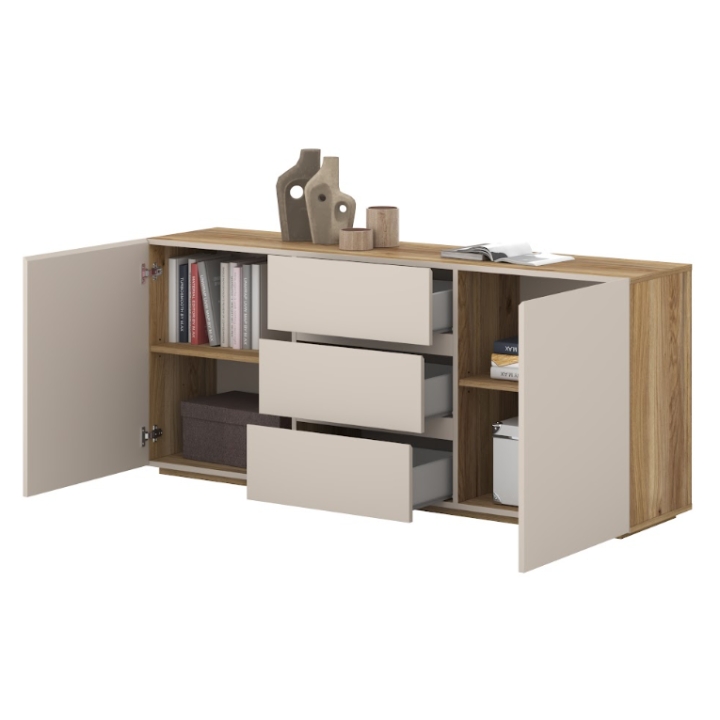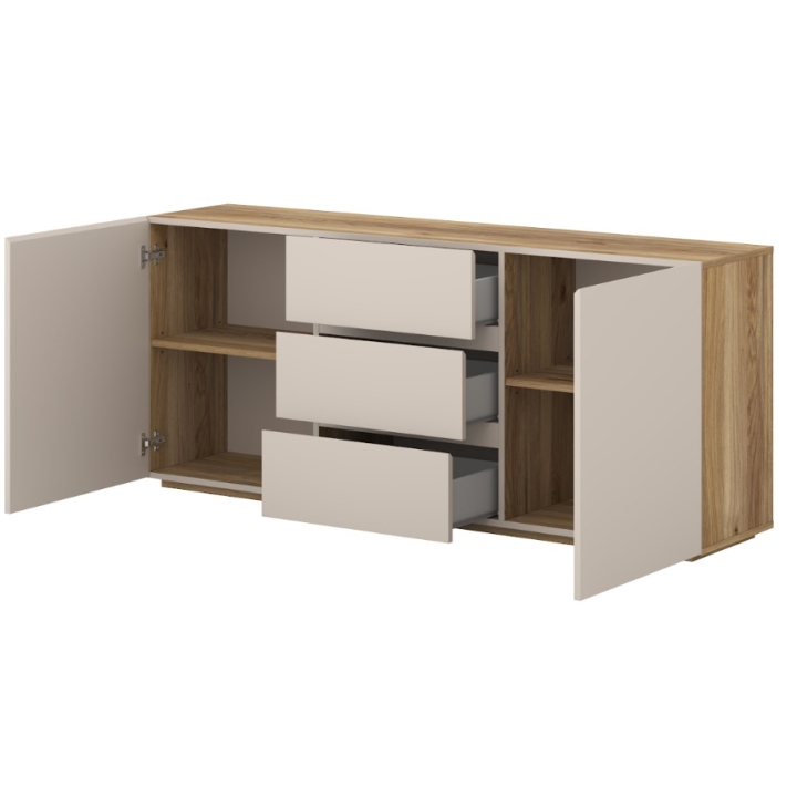 W centralnej części komody znajdują się trzy szuflady, które ułatwiają segregację mniejszych przedmiotów. Po bokach umieszczono dwie szafki z pełnymi frontami. Wewnątrz każdej z nich zamontowano dodatkową półkę, co dzieli przestrzeń na dwa poziomy i pozwala na wygodne ułożenie ubrań, dokumentów lub akcesoriów domowych.