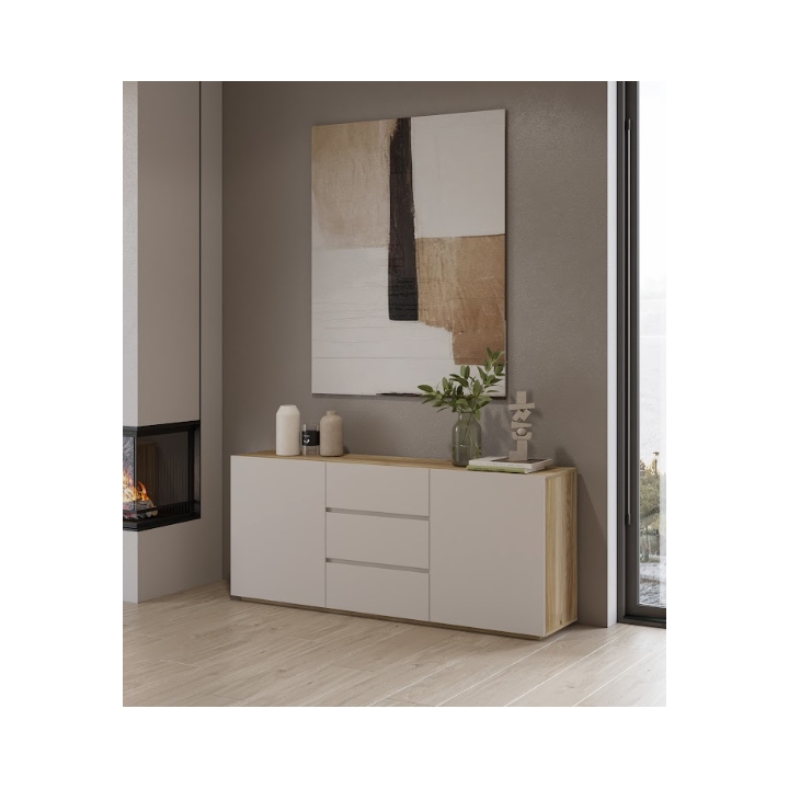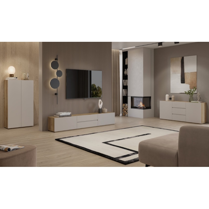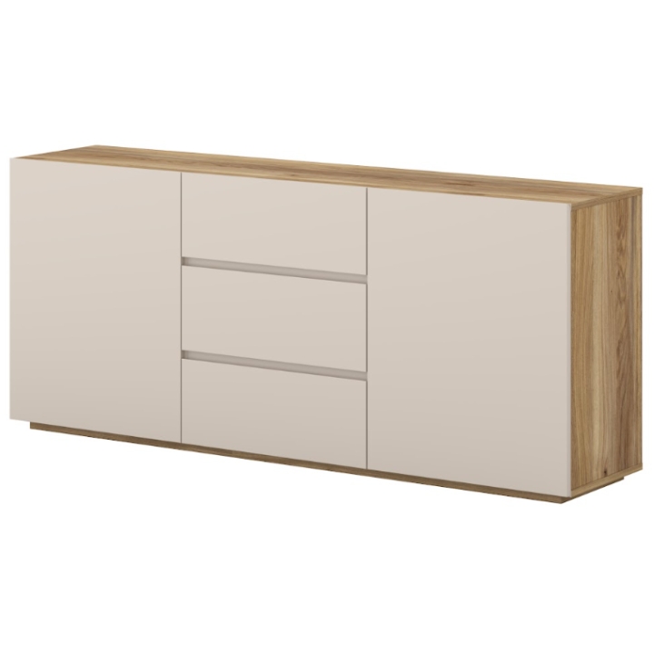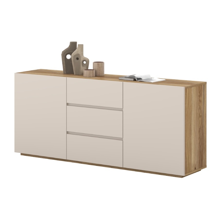Komoda Criss Typ 26 to mebel o szerokości 150 cm, wysokości 64 cm oraz głębokości wynoszącej 34 cm. Takie wymiary sprawiają, że jest to odpowiednie rozwiązanie do pomieszczeń, w których liczy się oszczędność miejsca, na przykład w wąskich korytarzach, sypialniach czy mniejszych salonach. Mebel łączy kolor kaszmirowy na frontach z blatem w naturalnym odcieniu dębu.