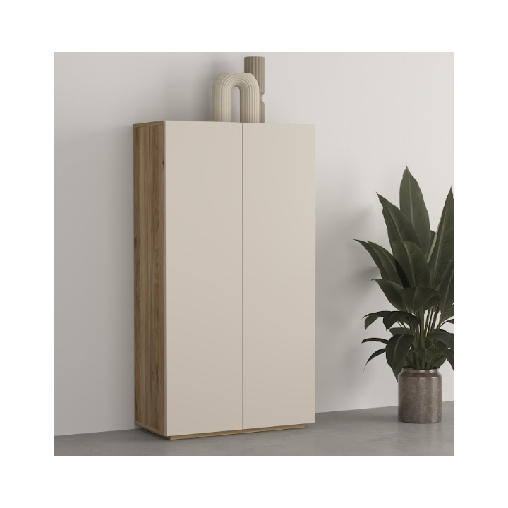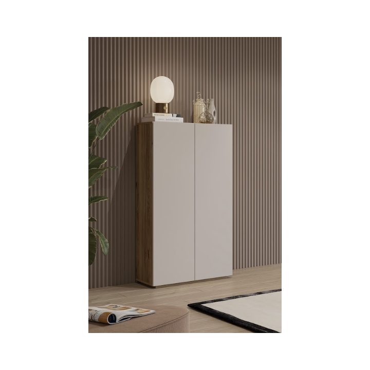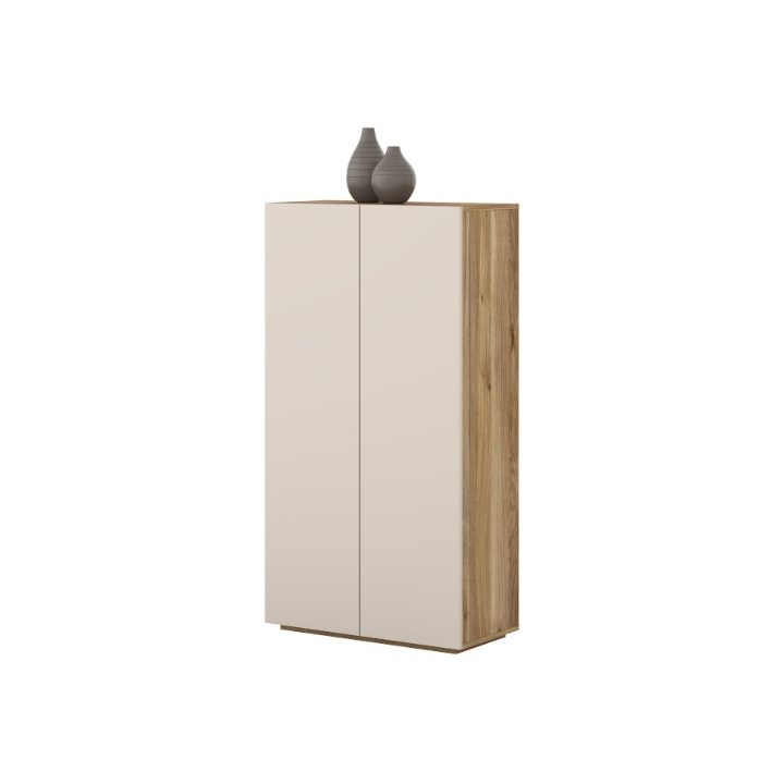 Komoda Criss Typ 42 to wysoki, dwudrzwiowy mebel o szerokości 70 cm, wysokości 130,6 cm oraz głębokości 34 cm. Dzięki pionowej konstrukcji i niewielkiej głębokości, mebel zajmuje mało miejsca na podłodze, oferując jednocześnie dużo przestrzeni do przechowywania wzwyż. Połączenie kaszmirowych frontów z górnym blatem w naturalnym odcieniu dębu nadaje bryle nowoczesny wygląd.
