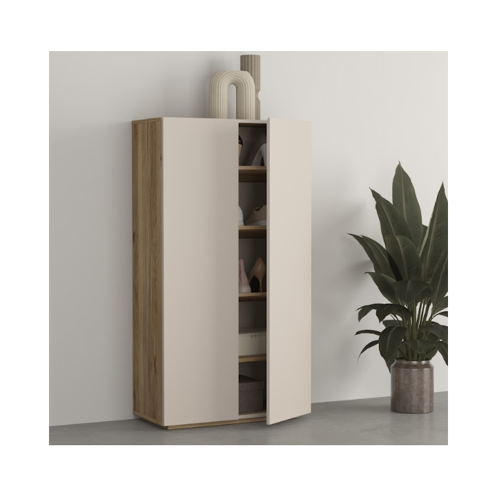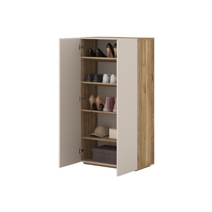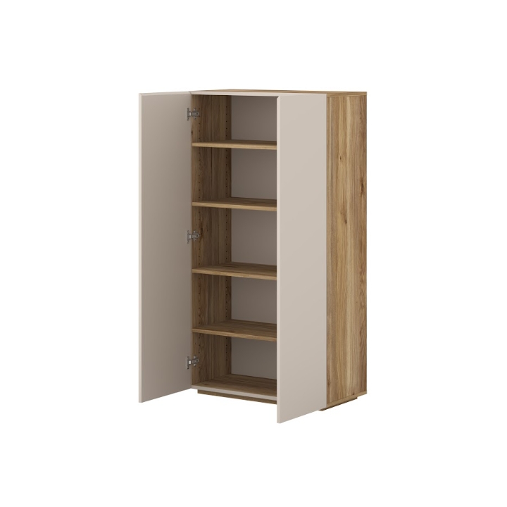 Wnętrze komody zostało podzielone czterema półkami, co tworzy pięć poziomów do układania przedmiotów. Taki podział sprawia, że mebel jest wielofunkcyjny - w sypialni lub salonie posłuży do segregacji ubrań i dokumentów, natomiast w przedpokoju sprawdzi się jako pojemna szafka na buty. Pełne fronty bez wystających uchwytów pozwalają ukryć zawartość i ułatwiają czyszczenie powierzchni.