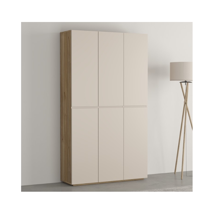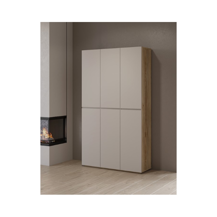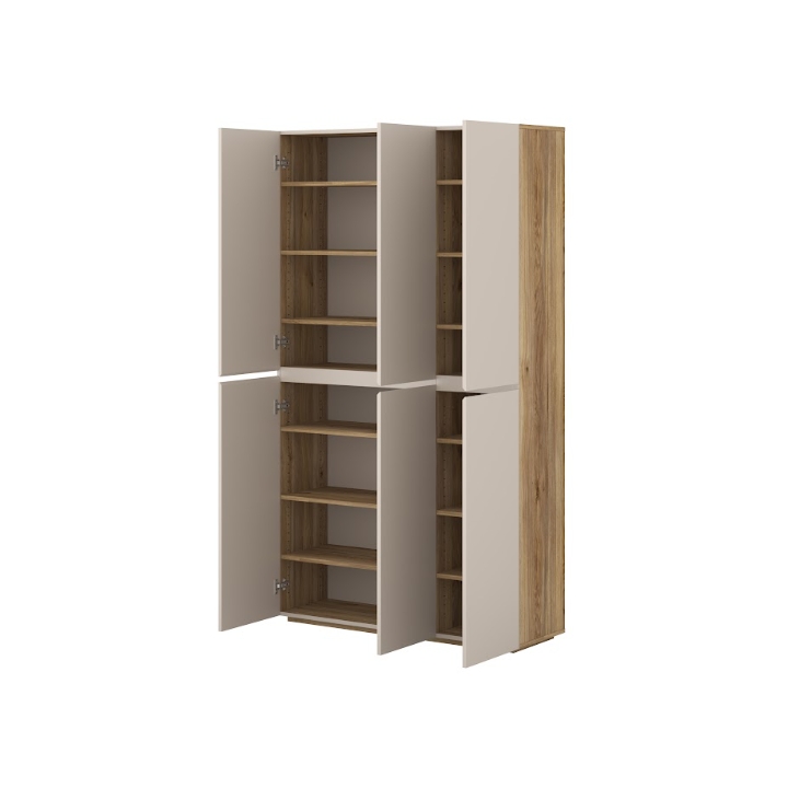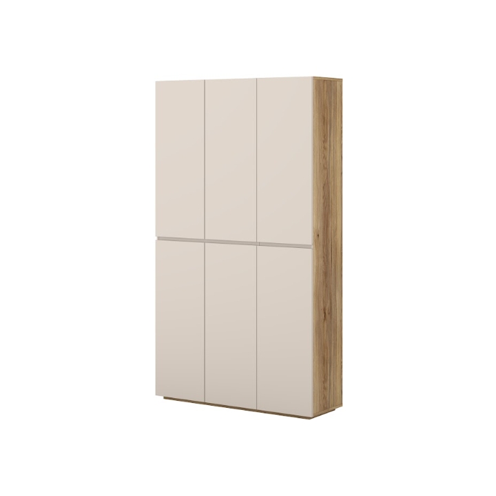 Komoda Criss Typ 78 to wysoki mebel o szerokości 105 cm, wysokości 183,6 cm oraz głębokości 34 cm. Dzięki swojej konstrukcji oferuje bardzo dużą przestrzeń do przechowywania. Kolorystyka bazuje na połączeniu matowych, kaszmirowych frontów z elementami w naturalnym odcieniu dębu, co pozwala na łatwe dopasowanie mebla do różnych wnętrz.