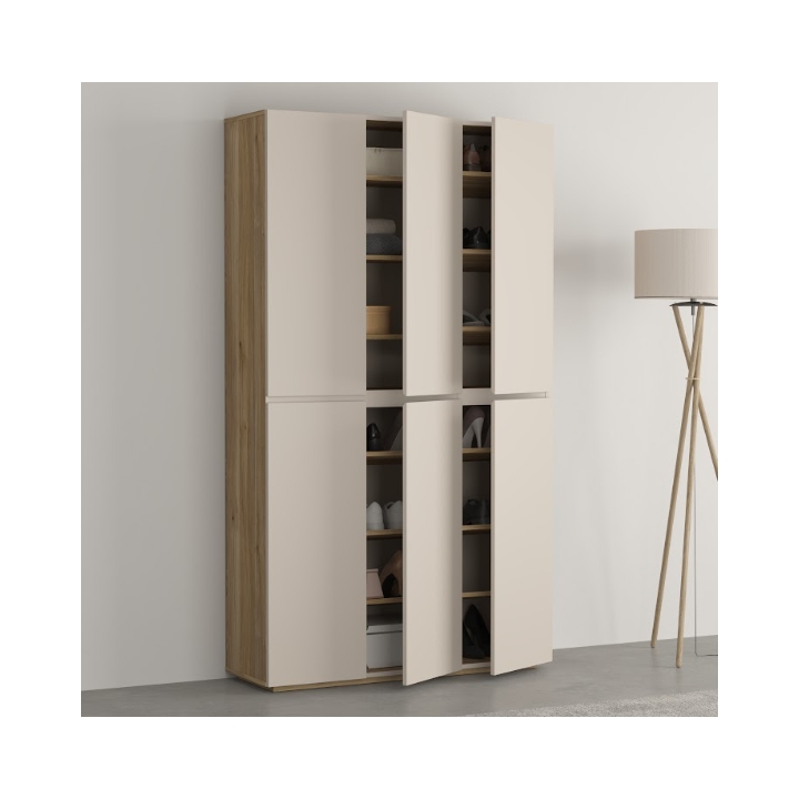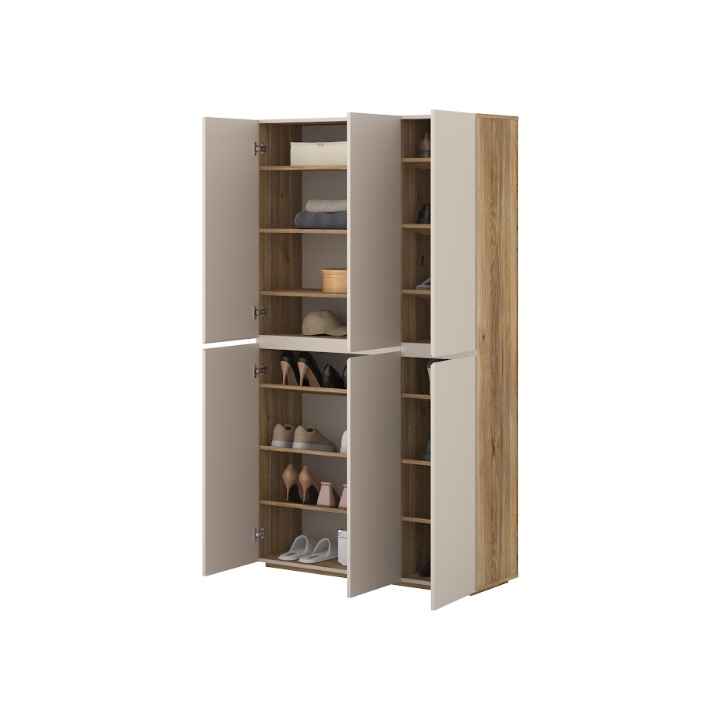 Mebel posiada aż sześć drzwiczek, które dają dostęp do czterech oddzielnych szafek. Wnętrze komody zostało zaprojektowane z myślą o maksymalnej organizacji - łącznie znajduje się tam 12 półek. Taki podział pozwala na wygodne posegregowanie dużej liczby przedmiotów, od dokumentów i tekstyliów domowych, po elementy garderoby.
