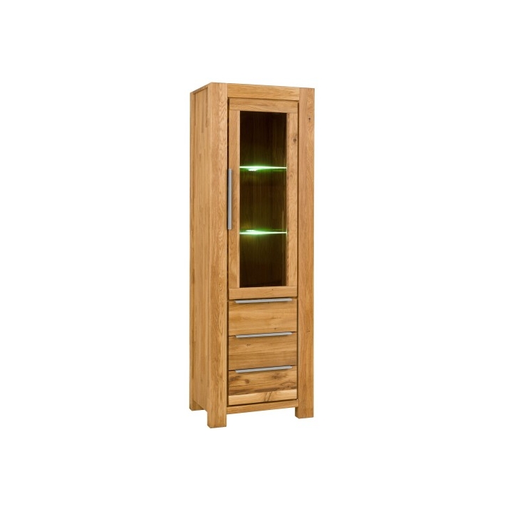 Za szklanymi drzwiczkami znajdują się półki stworzone z myślą o wyeksponowaniu szkła, porcelany lub drobnych dodatków, które zyskują dzięki temu odpowiednie tło. Niżej umieszczono trzy szuflady wykonane z litego dębu, osadzone na stabilnym prowadzeniu i wzbogacone metalowymi uchwytami, dzięki czemu umożliwiają przechowanie akcesoriów i przedmiotów codziennego użytku.
