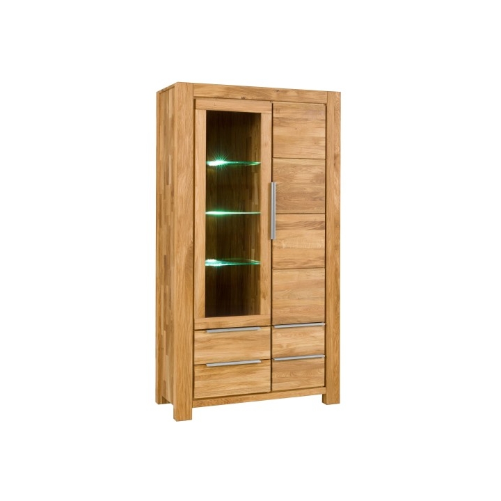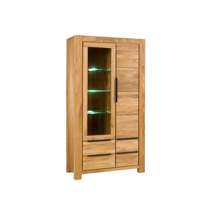 Powierzchnia została poddana olejowaniu, co pozwala zachować surowy rysunek deski i podkreśla jej autentyczny wygląd. Górna część witryny składa się z dwóch przeszklonych drzwi, za którymi umieszczono półki dające możliwość wyeksponowania szkła, porcelany lub dekoracji, z możłiwością. Przejrzysta tafla sprawia, że ustawione przedmioty są dobrze widoczne i zyskują odpowiednie tło.