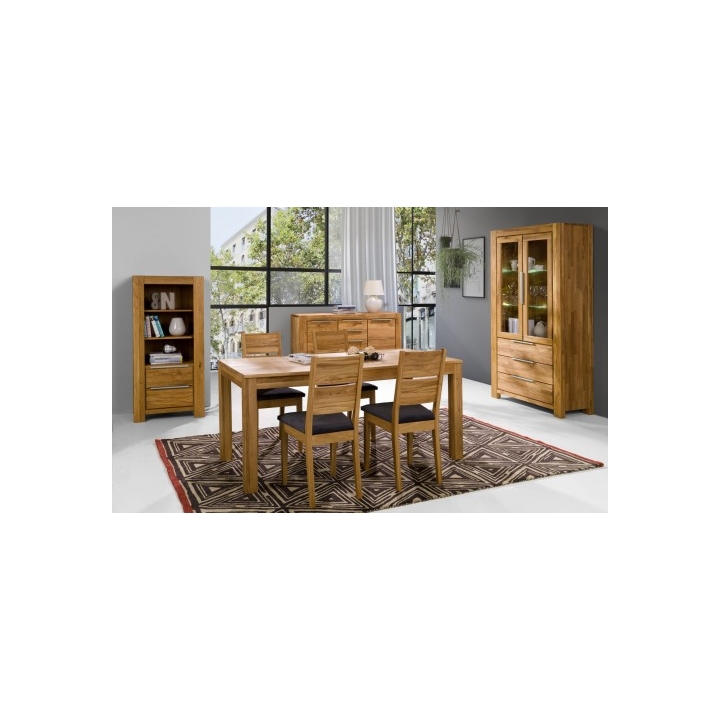 Witryna 2D4S Nena dąb od Meble Hugon o 200 cm wysokości, 112 cm szerokości i 45 cm głębokości łączy naturalny wygląd dębu z solidną konstrukcją tworzoną z litego drewna oraz fornirowanych elementów. Fronty, szuflady, drzwiczki i nogi wykonano z litego dębu, natomiast półki, przegrody i boki powstały z płyty fornirowanej, która zachowuje strukturę drewna i dodaje meblu wyrazistego charakteru.