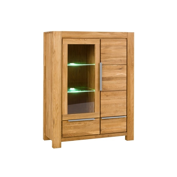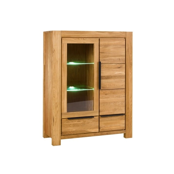 Powierzchnia została pokryta olejem, który uwydatnia rysunek deski. Witryna składa się z dwóch drzwi - jednych szklanych i drugich drewnianych, co umożliwia jednoczesną ekspozycję wybranych dekoracji oraz przechowywanie rzeczy, które warto trzymać poza zasięgiem wzroku. Szklaną część można uzupełnić o opcjonalne oświetlenie (za dodatkową opłatą).