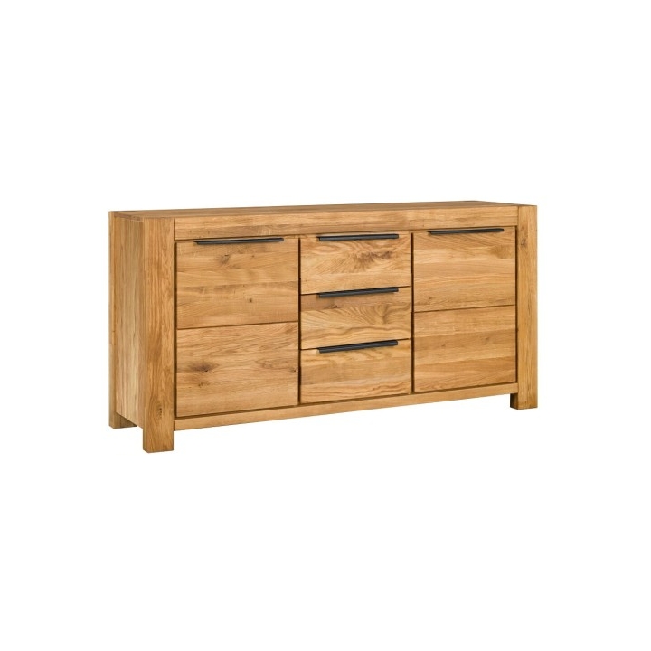 Komoda 2D3S Nena dąb od Meble Hugon o 86 cm wysokości, 175 cm szerokości i 45 cm głębokości prezentuje formę opartą na naturalnym charakterze dębu oraz starannym połączeniu litego drewna z elementami fornirowanymi. Front, szuflady, drzwiczki i nogi wykonano z litego dębu, natomiast półki, przegrody i boki powstały z płyty fornirowanej, która wiernie oddaje strukturę naturalnej deski.