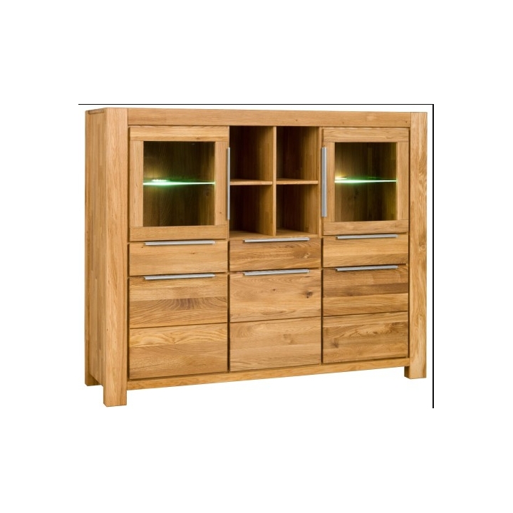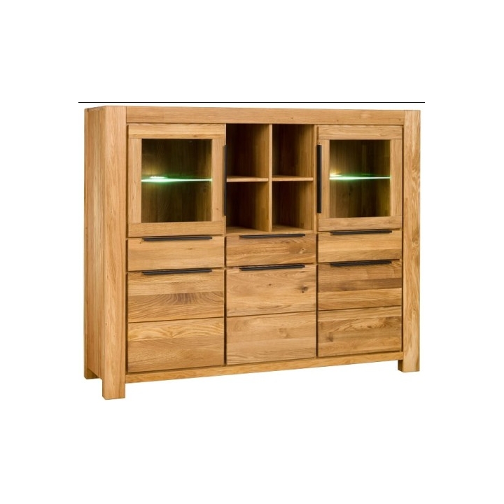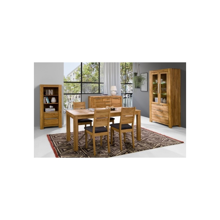 Powierzchnia została poddana olejowaniu, które podkreśla naturalny układ słojów oraz nadaje meblowi ciepły, autentyczny charakter. Szafka składa się z pięciu drzwi - dwóch przeszklonych oraz trzech drewnianych. Górna część z dwoma szklanymi gablotami pozwala wyeksponować szkło, pamiątki lub dekoracje, tworząc uporządkowaną przestrzeń do prezentacji. Półki można uzupełnić o opcjonalne oświetlenie (za dodatkową opłatą).