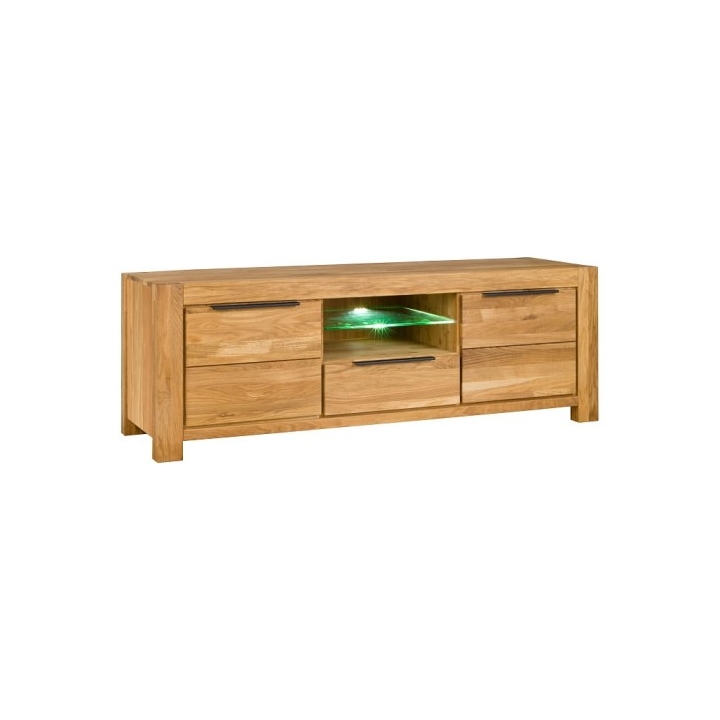 Całość zabezpieczono olejowaniem, które podkreśla naturalny rysunek drewna oraz chroni powierzchnię przed codziennym użytkowaniem. Szeroki blat bez trudu mieści telewizory dużych rozmiarów, a dwie otwarte wnęki umieszczone tuż pod nim tworzą przestrzeń na konsolę, dekoder czy odtwarzacz, zapewniając łatwy dostęp do przewodów i odpowiednią wentylację sprzętu.
