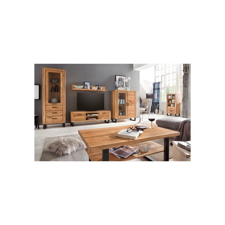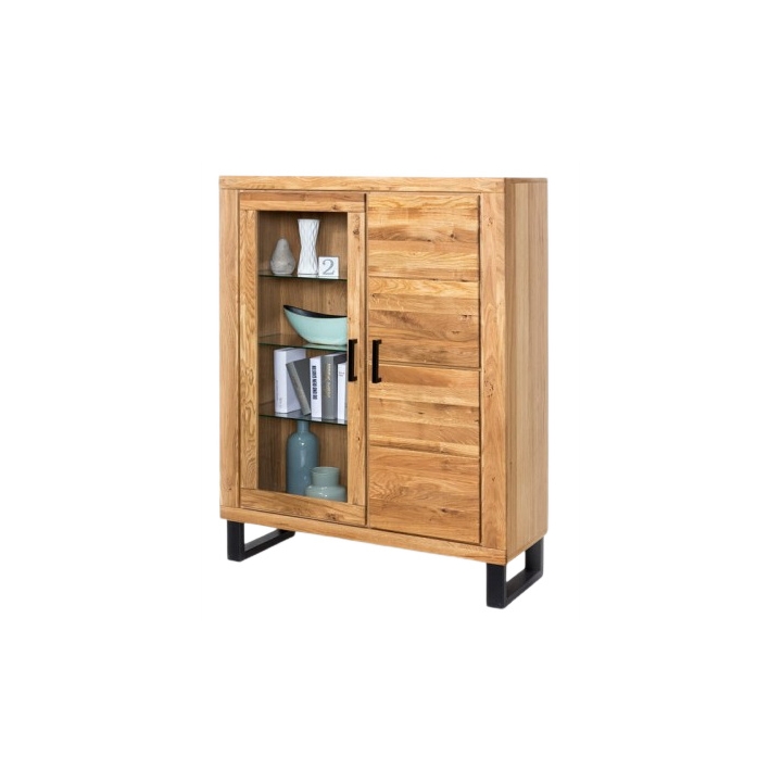 Witryna składa się z przeszklonej strefy z trzema półkami, na których można ustawić szkło, zastawę lub dekoracje, a możliwość opcjonalnego podświetlenia szklanych elementów pozwala wydobyć głębię prezentowanych przedmiotów. Obok niej znajdują się drzwi drewniane z pełnym frontem, oferujące zamkniętą przestrzeń na akcesoria, tekstylia lub elementy, które powinny pozostać poza zasięgiem wzroku.