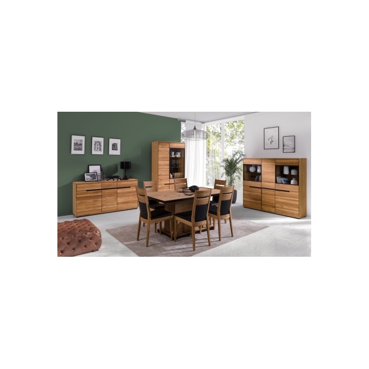 Witryna pojedyncza Lola od Meble Hugon o 196 cm wysokości, 62 cm szerokości i 40 cm głębokości to smukła, wysoka forma łącząca funkcję ekspozycyjną z miejscem do przechowywania. Front wykonano z litego drewna dębowego, natomiast korpus powstał z płyty fornirowanej, co pozwala zachować spójny rysunek słojów i ciepły charakter drewna.