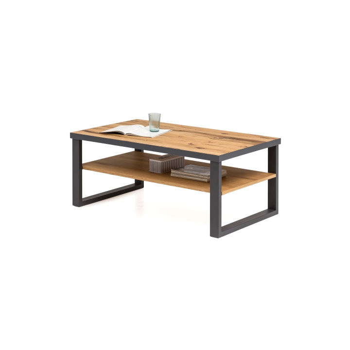 Połączenie ciepłego odcienia dębowego forniru z industrialnymi elementami sprawia, że stolik dobrze odnajduje się w nowoczesnych aranżacjach, zarówno w przestronnych salonach, jak i w bardziej kameralnych strefach wypoczynkowych. Stolik może stanowić samodzielny akcent aranżacyjny lub uzupełnienie większego zestawu.
