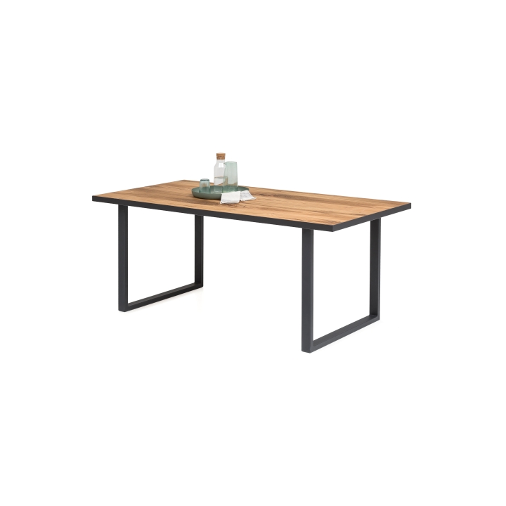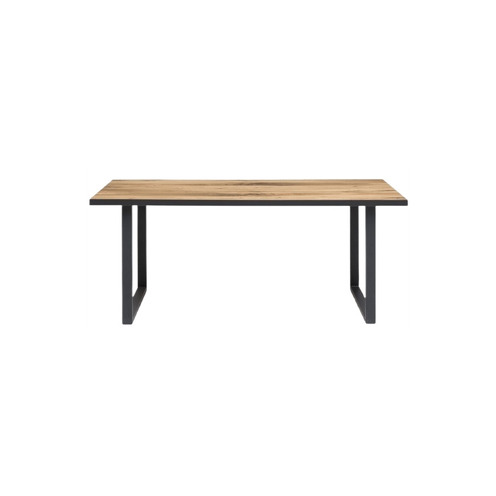 Prostokątny kształt blatu wprowadza ponadczasowy charakter, a fornirowana płyta w odcieniu dąb naturalny prezentuje subtelny rysunek drewna, który ociepla przestrzeń i tworzy przyjazną atmosferę. Solidna metalowa konstrukcja podstawy obejmuje geometryczne nogi, wprowadzające ciekawy kontrast między jasnym blatem a czarną podstawą.