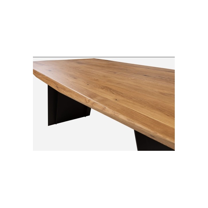 Prostokątny blat wykonano z litego drewna dębowego, którego struktura została podkreślona pokryciem olejowym. Jasny odcień dębu eksponuje rysunek słojów i wprowadza do wnętrza ciepło, tworząc przyjazny i spokojny ton. Metalowe nogi malowane na czarno dodają całości mocnego, nowoczesnego akcentu, tworząc kontrast z jasnym blatem. Takie zestawienie materiałów sprawia, że stół staje się wyrazistym elementem aranżacji, który z łatwością odnajduje się we wnętrzach loftowych, nowoczesnych, ale także w przestrzeniach o bardziej klasycznym charakterze.