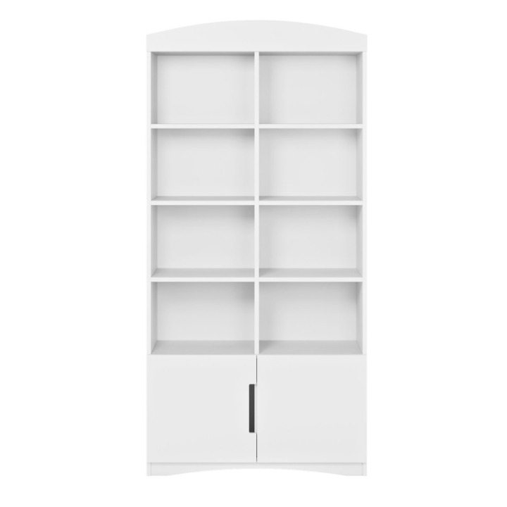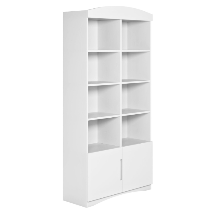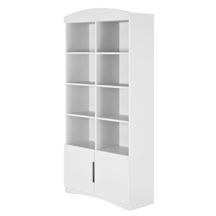 Konstrukcja regału opiera się na otwartym układzie ośmiu półek o wymiarach 42 x 29 x 33,5 cm każda. Taki podział pozwala na łatwy dostęp do najczęściej używanych przedmiotów. W dolnej części mebla znajduje się dodatkowa szafka z podwójnymi drzwiczkami, wewnątrz której ukryto jeszcze jedną półkę. To rozwiązanie pozwala na przechowywanie rzeczy, które mają pozostać niewidoczne. Zamiast tradycyjnych uchwytów zastosowano ergonomiczne wycięcia we frontach, co zwiększa bezpieczeństwo dziecka.