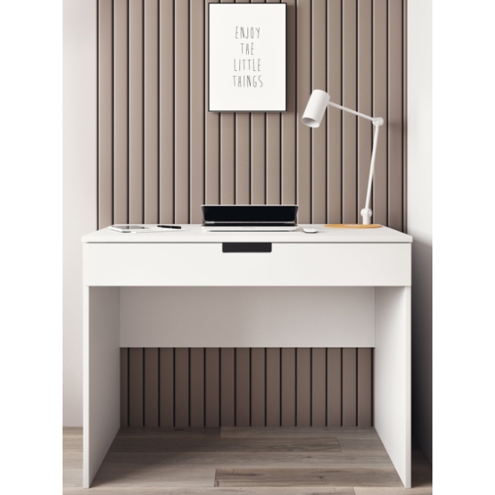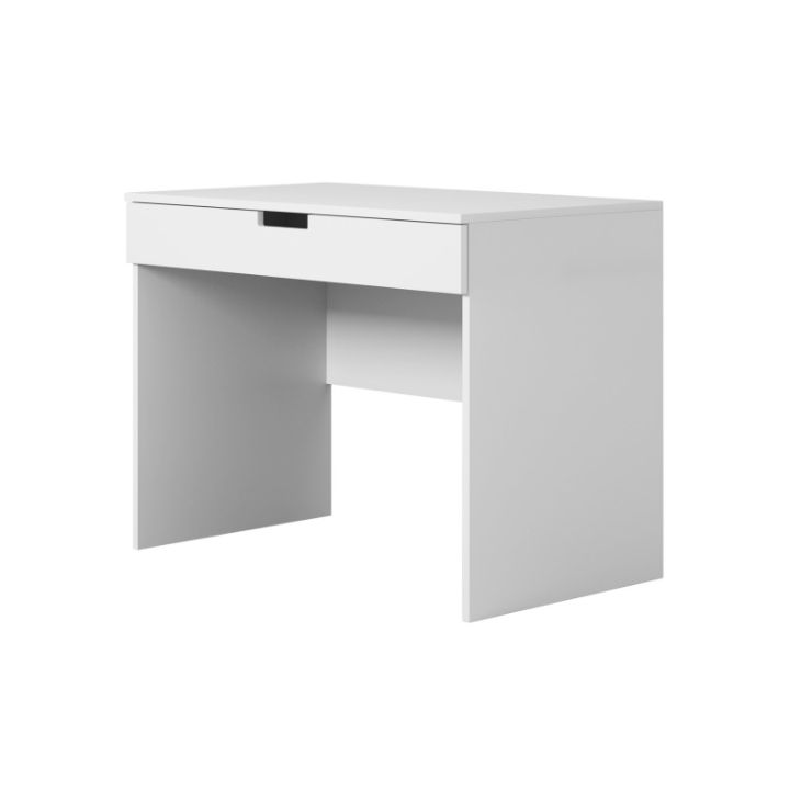 Biurko z kolekcji Tomi to mebel zaprojektowany jako centralny punkt kącika do nauki i zabawy. Ma szerokość 100 cm, wysokość 75,5 cm oraz głębokość 60 cm. Takie wymiary zapewniają przestronny blat, który pozwala na wygodne rozłożenie książek, zeszytów oraz akcesoriów biurowych, gwarantując komfort nawet podczas dłuższej nauki. Mebel utrzymany jest w jednolitej, białej kolorystyce.