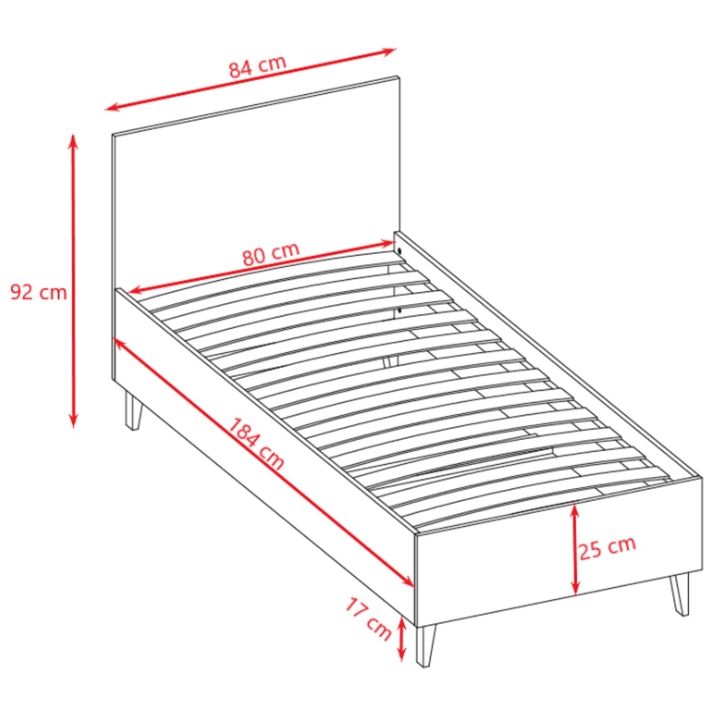 Łóżko Kubi to mebel o prostej formie, który łączy minimalizm z naturalnymi akcentami. Przy wymiarach 184 cm głębokości, 84 cm szerokości oraz 92 cm wysokości, oferuje powierzchnię spania 180x80 cm. Konstrukcja została wykonana z solidnej płyty meblowej o grubości 18 mm. Cechą charakterystyczną tego modelu są wysokie nogi z litego drewna dębowego, które zabezpieczono bezbarwnym, ekologicznym lakierem.