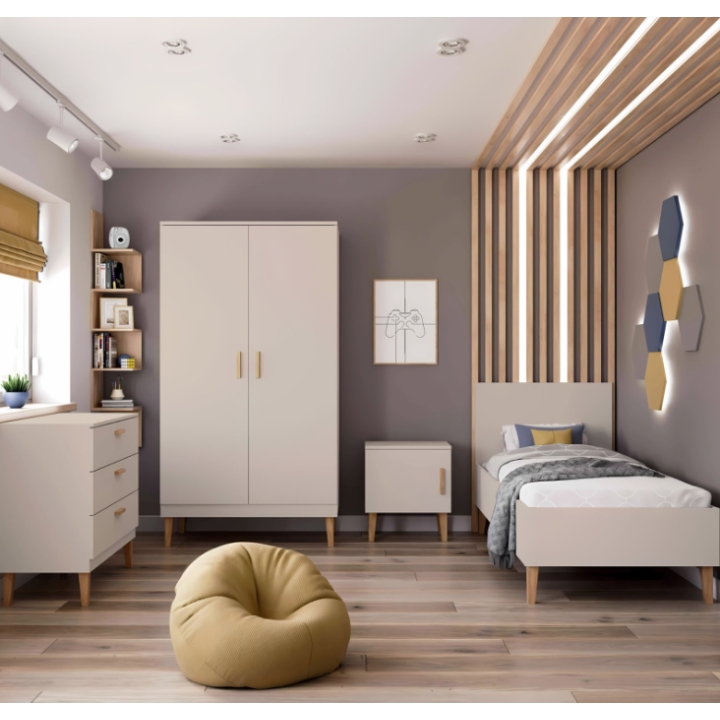 Łóżko Kubi dostępne jest w kilku wariantach kolorystycznych, w tym w nowoczesnym odcieniu kaszmirowym, co pozwala na dopasowanie go do wystroju pokoju dziecięcego lub młodzieżowego.