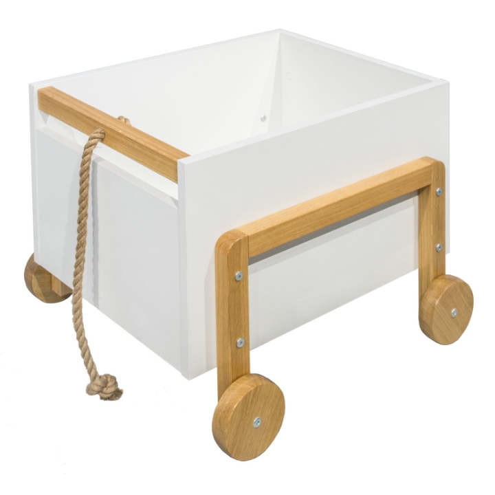 Mebel został wyposażony w cztery dębowe kółka, które pozwalają na swobodne przemieszczanie skrzyni we wszystkich kierunkach. Na froncie zamontowano sznurek ułatwiający dziecku lub rodzicowi ciągnięcie kontenerka w miejsce zabawy.