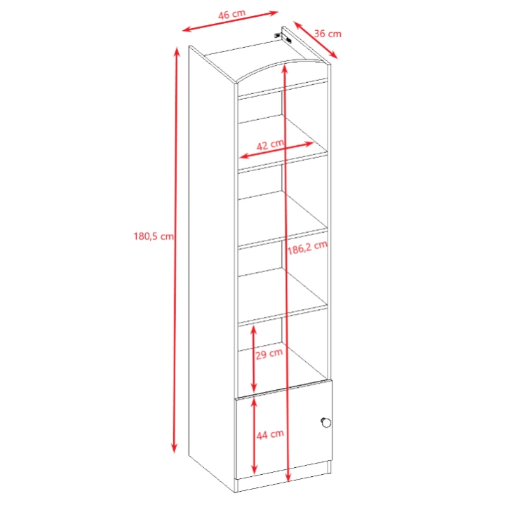 Pojedynczy regał z kolekcji Babydreams to mebel zaprojektowany z myślą o efektywnym zagospodarowaniu przestrzeni w pokoju dziecięcym lub młodzieżowym. Ma 46 cm szerokości, 180,5 cm wysokości oraz 36 cm głębokości.