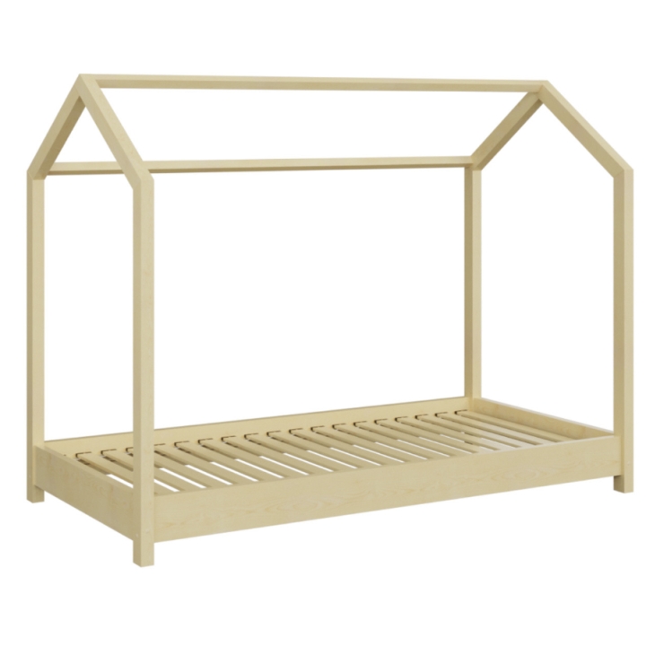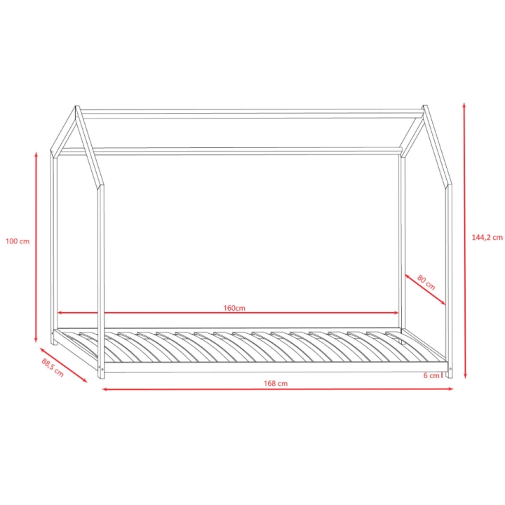 Łóżko Bella to mebel w kształcie domku, zaprojektowany w minimalistycznym stylu z myślą o najmłodszych użytkownikach. Konstrukcja ma 168 cm szerokości, 144,2 cm wysokości oraz 88,5 cm głębokości. Niska budowa mebla ułatwia dziecku samodzielne wchodzenie i schodzenie, co sprzyja nauce niezależności oraz bezpiecznemu odkrywaniu otoczenia.