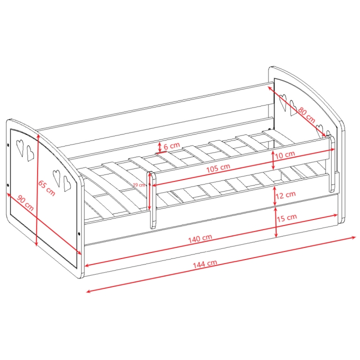 Łóżko Julia to mebel o minimalistycznej formie, zaprojektowany z myślą o pokojach dziecięcych. Konstrukcja ma 144 cm szerokości, 65 cm wysokości oraz 90 cm głębokości. Charakterystycznym elementem wykończenia są ozdobne wycięcia w kształcie serduszek na frontach. Mebel jest dostępny w trzech rozmiarach, co ułatwia jego dopasowanie do metrażu pomieszczenia.